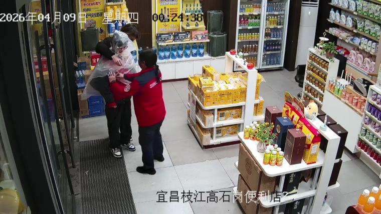 4月8日深夜11时34分,暴雨突袭湖北宜昌。两名骑着摩托车的年轻人浑身湿透,狼狈地冲进中国石化宜昌石油高石岗加能站便利店避雨。