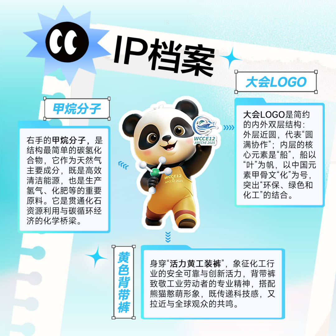 他是2025国际化工创新展览会的“最萌代言人”。这可不是普通大熊猫哦,化熊右手托着甲烷化学分子结构,象征行业基石;左手高举大会LOGO,宛如一把打开化工魔法世界的大门钥匙。